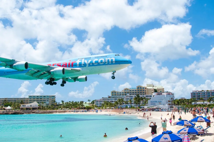 Esta playa caribeña, famosa por sus aguas turquesas, se ha convertido en un lugar peligroso e incómodo debido a su cercanía con el aeropuerto Princesa Juliana. Los aviones comerciales (incluyendo Boeing 747 y Airbus A340) aterrizan a solo 25 metros sobre la playa, generando turbinas que levantan tormentas de arena, vuelan sombrillas y alcanzan niveles de ruido de 120 decibeles (equivalentes a un concierto de rock).
